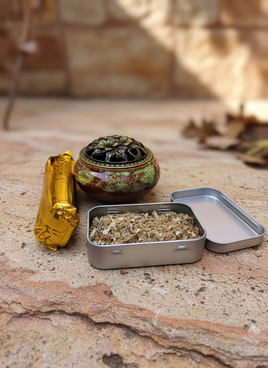 1 x tin of hand crafted and blended incense (mugwort, sage, juniper, resins and cedar)